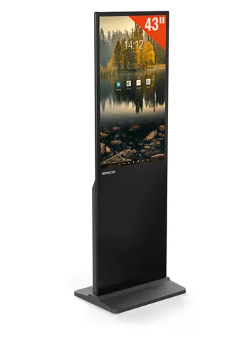 Mit dem digitalen Kundenstopper DKS-LED43 von TecMaschin können Sie ideal Werbung kundenwirksam darstellen. Darüber hinaus lassen sich Unternehmenspräsentationen, Produkte und Dienstleistungen und viele weitere Informationen über die digitale Anzeige abspielen. Die Werbestele ist optimal für die Nutzung in Showrooms, auf Messen, in der Gastronomie oder in Eingangsbereichen geeignet. Auch auf Sonderverkaufsflächen in Geschäften ist der leuchtende Blickfang mit den zwei integrierten Lautsprechern ein echter Hingucker. Die 1.810 mm hohe digitale Anzeigetafel ist mit ihren 66 mm besonders schmal und begeistert mit ihrem geringen Eigengewicht von nur 34 kg. Mit einer Bildschirmdiagonale von 43 in (9:16) und der Auflösung in 1.080 x 1.920 px gewinnen Sie die Aufmerksamkeit von Passanten und potentiellen Kunden. Hierfür sorgt auch das patentierte LED-Modul mit mehr als 6,7 Mio. darstellbaren Farben und einem Kontrast von 3000:1.